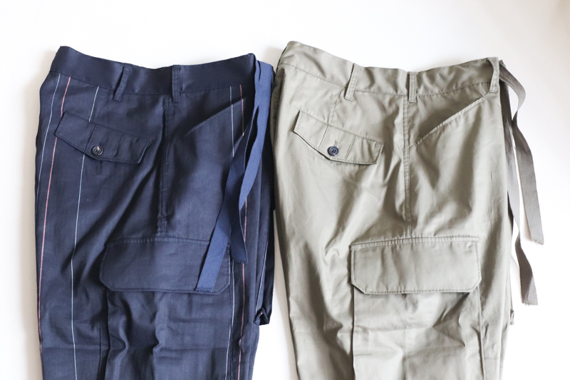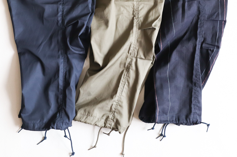 ウエストのコードを縛ってガバッと穿いていただく個性的なパンツです。穿く人によって大きく印象を変える面白みある一本。裾にドローコード、膝にダーツ、フロントジッパーは大きめサイズのものをあえて使い、ミリタリーの雰囲気を強く感じさせる仕上がりになっています。