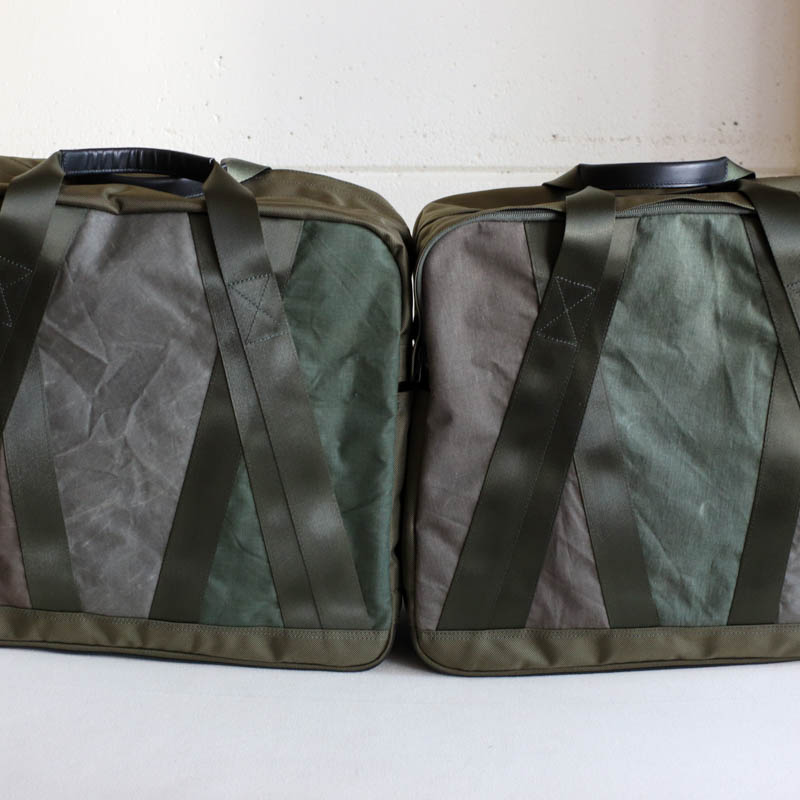 色々なカラーのドイツ軍テント素材をデザイナー自らが裁断し、色の組み合わせを考えてデザインされたバッグで強度を保つために真ん中にCORDURA AIR BALLISTICと呼ばれる強度が強いナイロン生地を挟み込み、裏地にはリサイクルポリエステル素材が綺麗に張られた3枚仕立て。