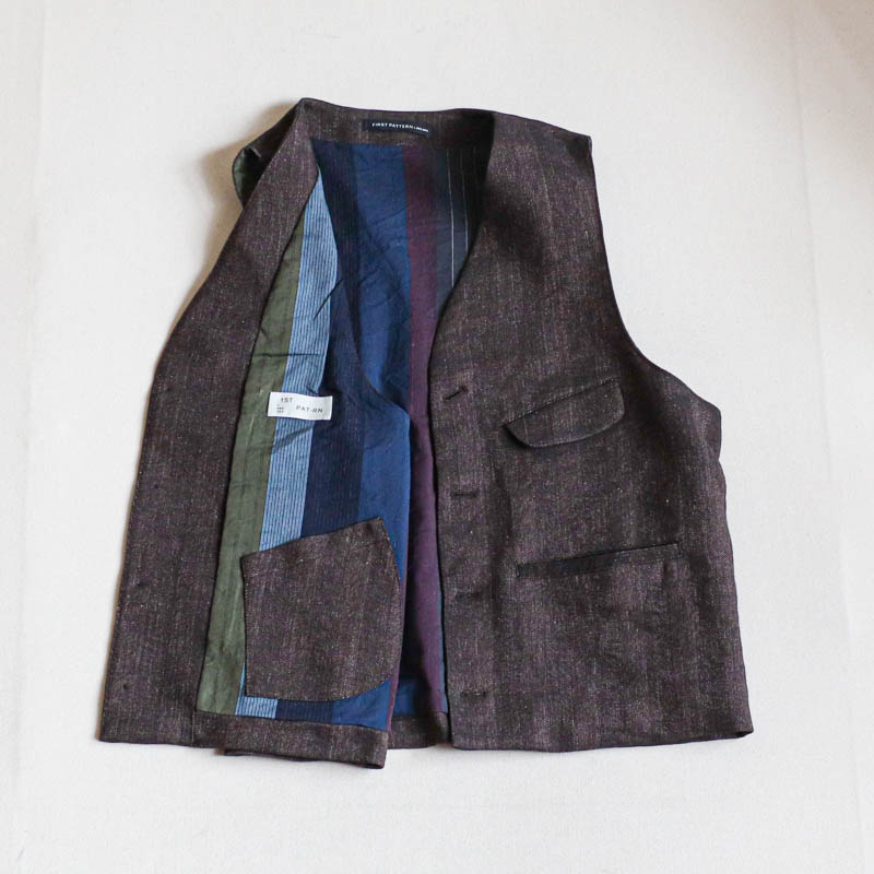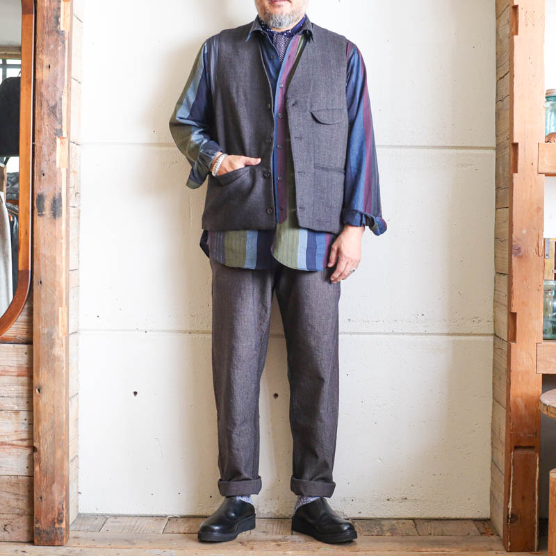 不規則なマイクロヘリンボーン柄が独特の表情を醸し出し、非常にソフトな幅触りのウールとコットンの混紡地は、柔らかく落ち感も楽しんで頂ける大人なベストです。