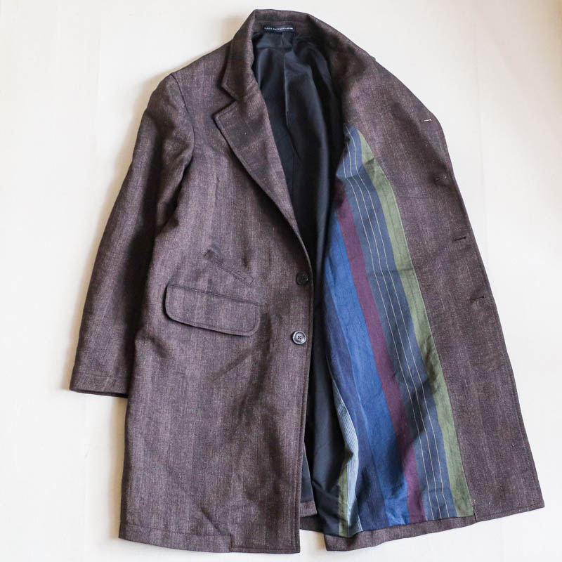 大きく仕上げられたヘリンボーン柄が独特の表情を醸し出し、非常にソフトな幅触りのウールとリネンとコットンの混紡地は、柔らかく落ち感も楽しんで頂ける大人なコートです。