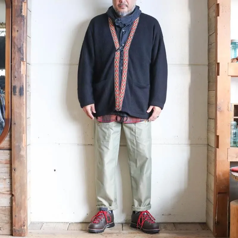南米のペルーらしい独特なテープ使いが斬新な、着丈を少し長くして頂いた、アルパカのカーディガンとなります。
