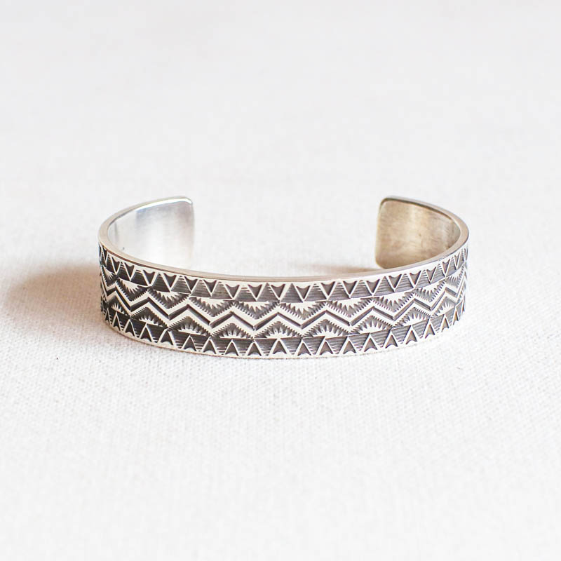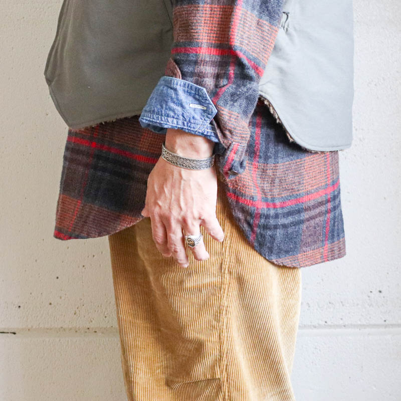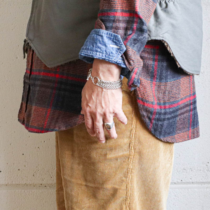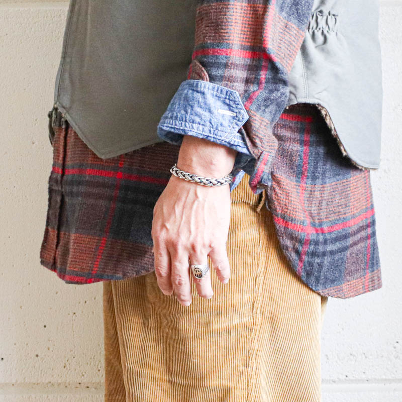 インゴットシルバーとは、一度シルバーを溶かし塊にしてからまた叩き直して作る技法で厚みを出すことが可能で、存在感と迫力があるのが魅力です。扱いやすいサイズで重ね付けするには丁度良い太さです。