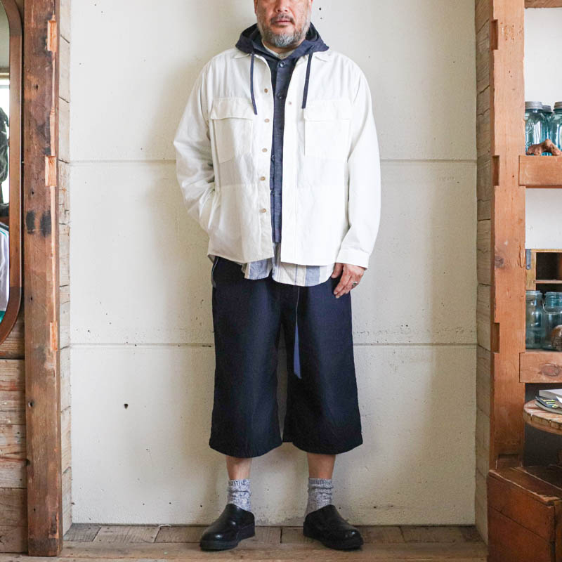 Notionジャケットは、カバーオールみたいな見た目が特徴的で、ラフにやや大きめにガバッと着こなしても、ジャストサイズで着て頂いてもさまになるジャケットです。